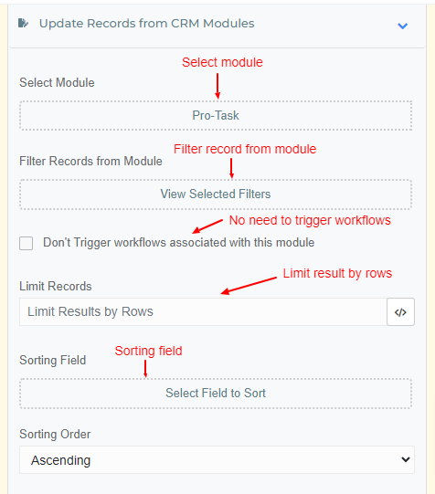 Select the field to update in the module. Here we can select multiple fields for updating.