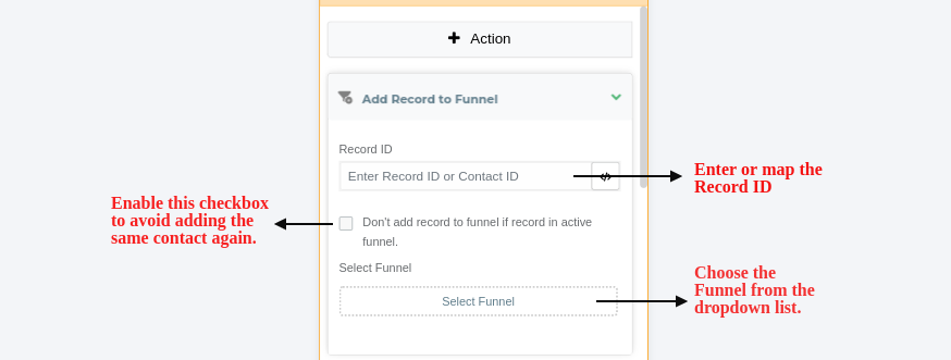Optional: Check the “Don’t Add Record to Funnel if Contact is Already in Funnel” checkbox to avoid adding the same contact again.
