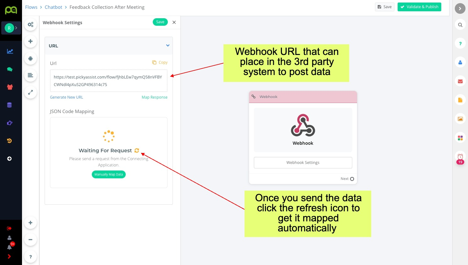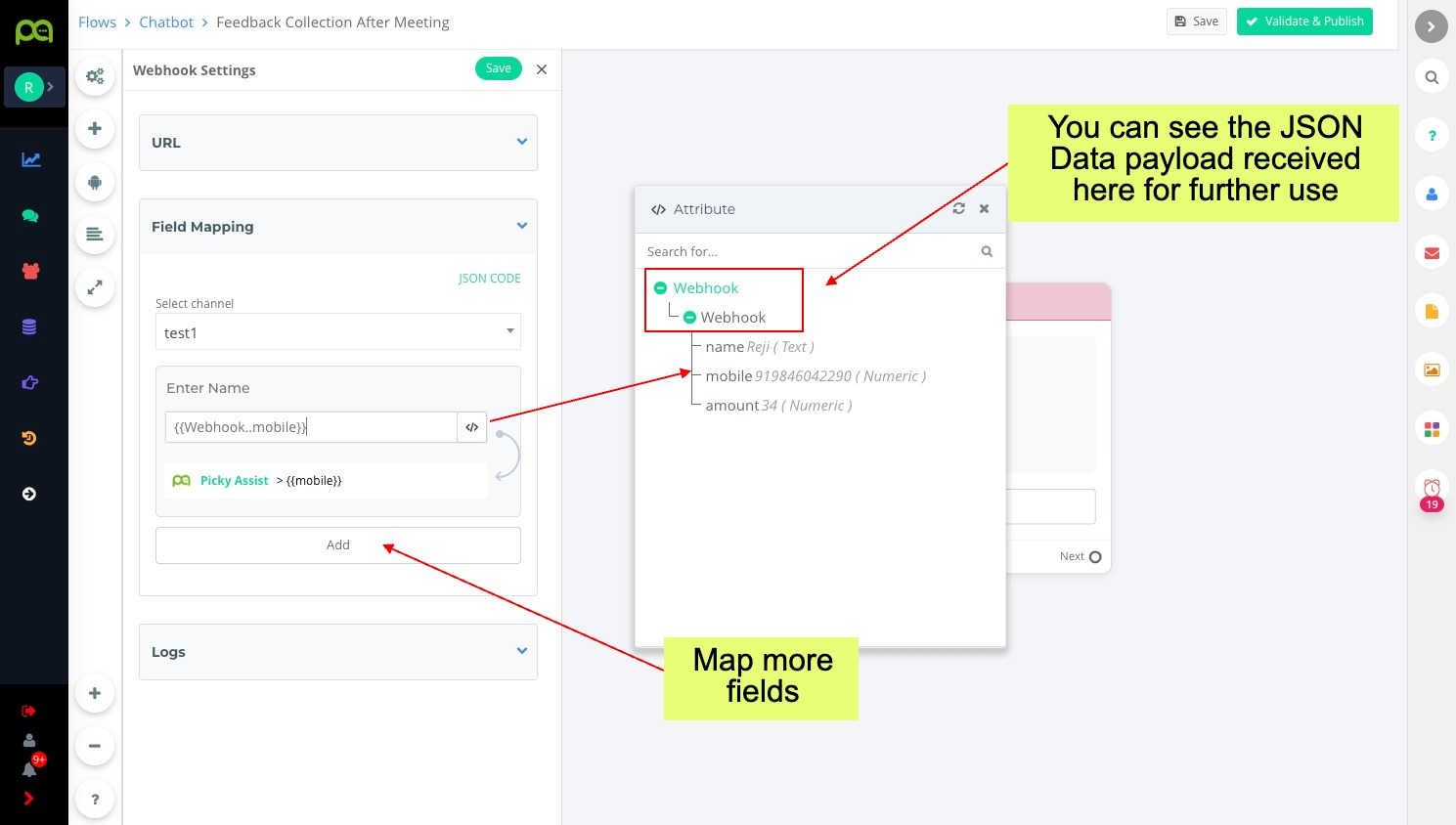 Whenever you add a step, it creates a unique webhook for that step as shown below. You need to send a data payload to this URL in either JSON or query string format. After sending the payload, click on the refresh button so the system can fetch and map the data inside the flow. This data will then be available for further use in the attributes.